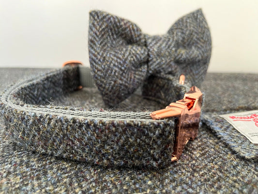 Sherlock Grey Herringbone Harris Tweed Dog Collar & Bow-Tie Set