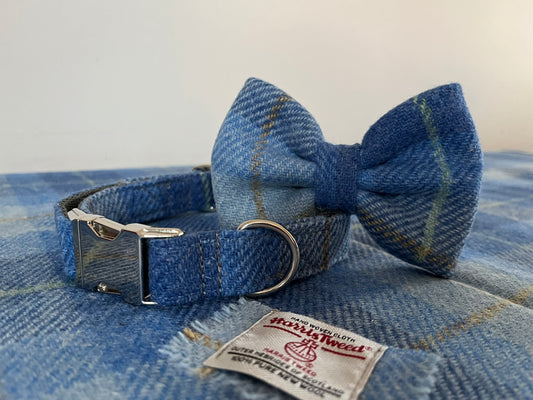 Skye Blue Check Harris Tweed Dog Collar & Bow-Tie Set