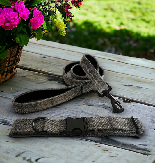 Smoke Grey Check Harris Tweed Dog Collar & Lead Set (with optional Bow-tie)