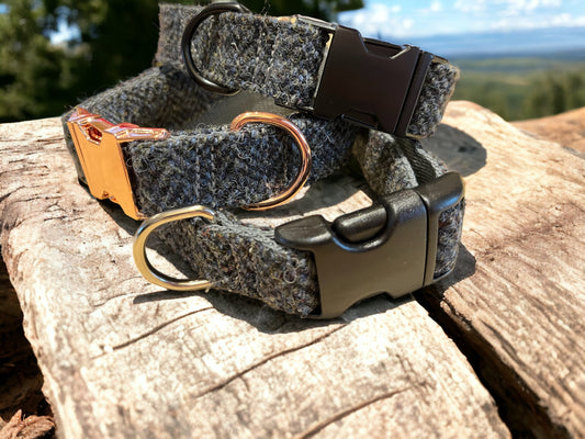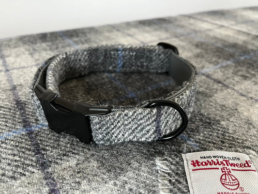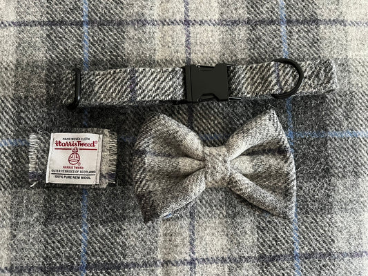 Smoke Grey Check Harris Tweed Dog Collar & Lead Set (with optional Bow-tie)