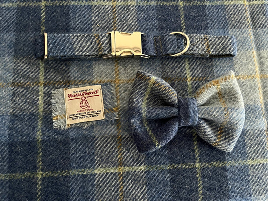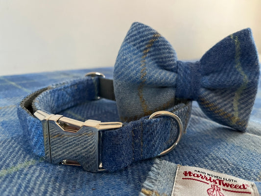Skye Blue Check Harris Tweed Dog Collar & Bow-Tie Set