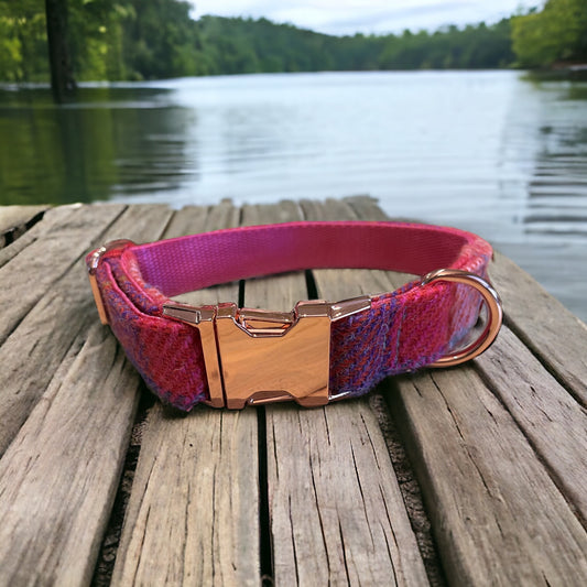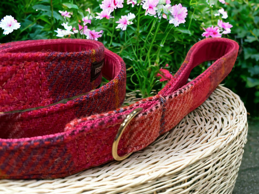 Fuchsia Check Harris Tweed Dog Collar & Lead Set (with optional Bow-tie)